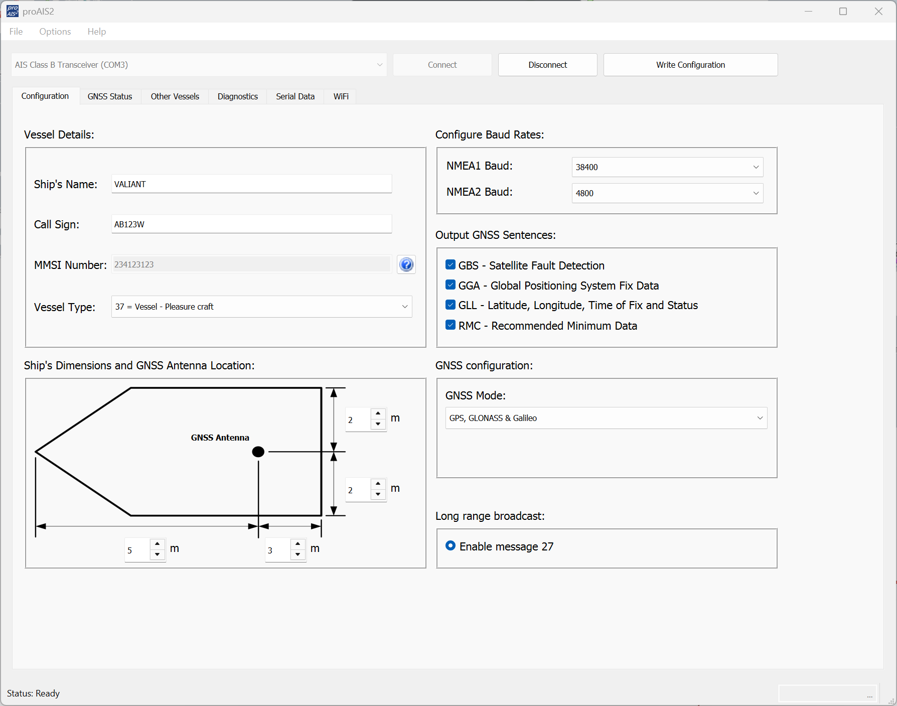 ProAIS2 is a Software application for setting and editing the configuration of your AIS transceiver. It connects via USB to your Transceiver and allows all AIS Static data, including Vessel name, Call Sign, MMSI, Vessel Type and Vessel dimensions, to be set or updated*.