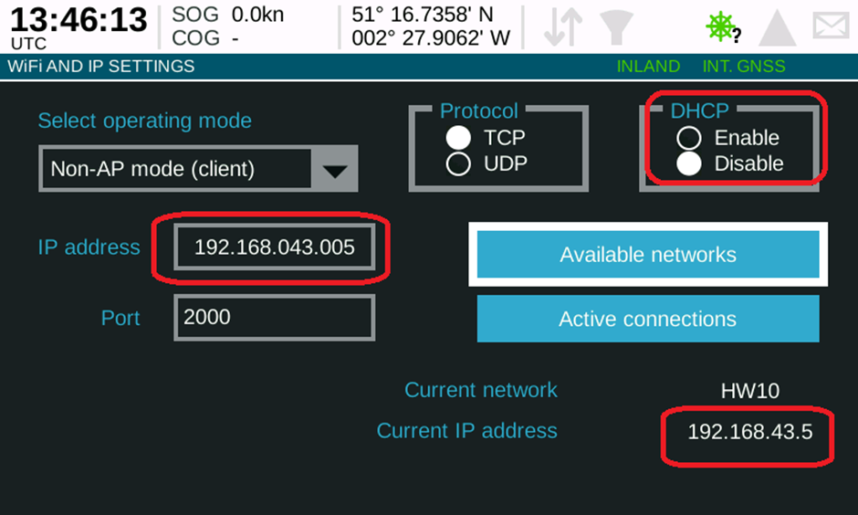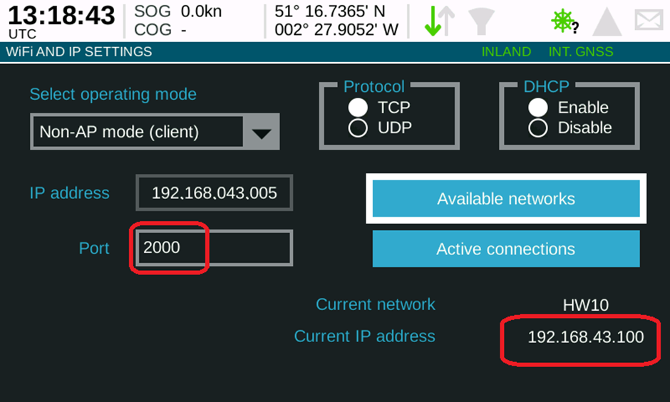 - Finally either using Hyper Terminal or AIS application such as Navionics etc, connect to the IP address that’s been assigned by the WiFi access point you connected to. In the example below 192.168.43.100 via DHCP being enable.